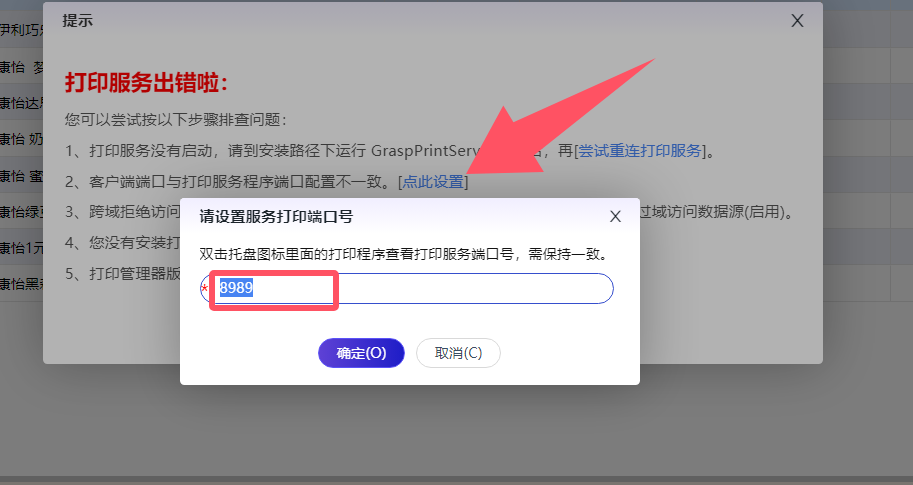 2、如果出现下面的提示:打印服务出错啦,如下图所示的端口是8989 请不要做任何修改,点击【尝试重连打印服务】即可。