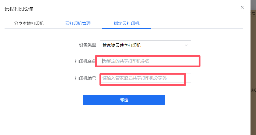 机器名称输入打印机名称,打印机编号:就是分享本地打印机界面的分享码,可以直接复制粘贴, 录入时要注意前后不能有空格。配置好之后点击【绑定】按钮。如下图所示: