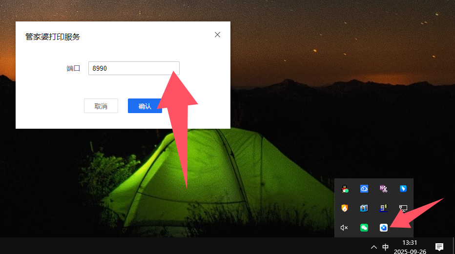 1、安装打印管理器之后,电脑右下角会显示如下图所示的蓝白色方块图标,此图标为全能打印服务,双击会显示管家婆打印服务端口,此端口默认为8990,请不要做修改。