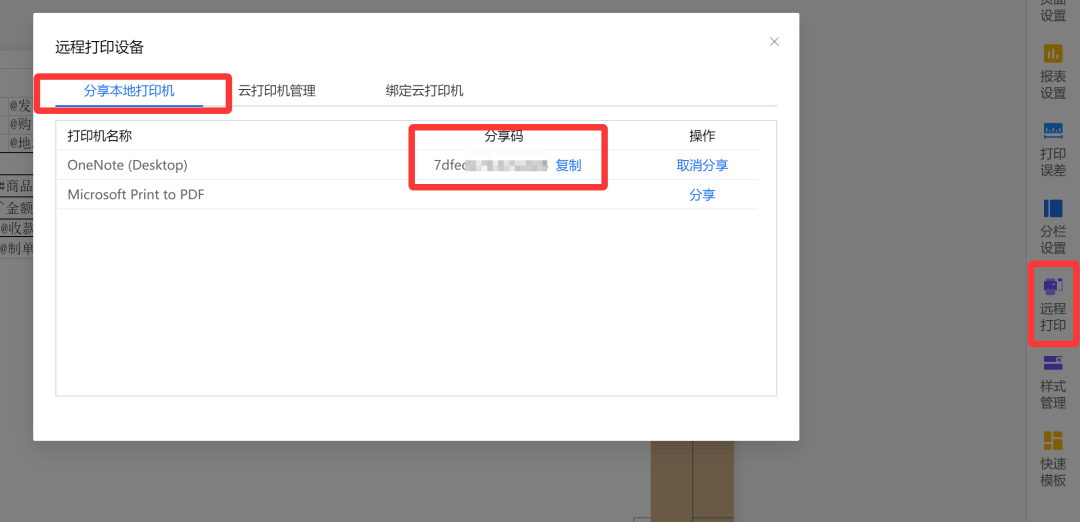 单据或者报表进入样式编辑界面点击右侧的【远程打印】,找到【分享本地打印机】该界面会自动带出计算机上已安装的打印机名称,选择打印机点击分享 按钮 就会显示出分享码