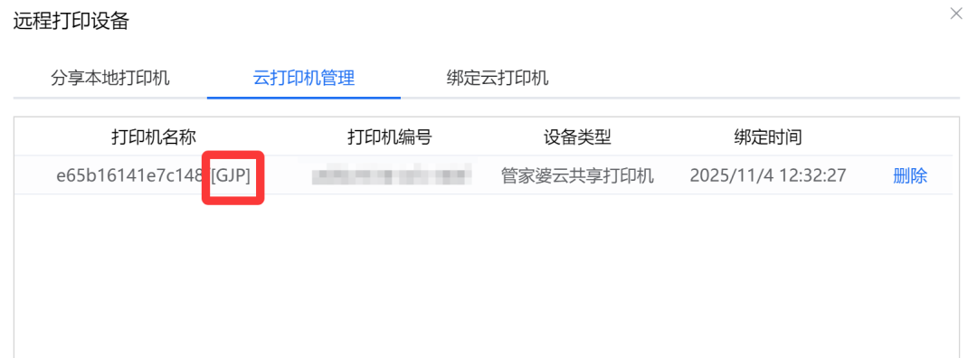 绑定之后在【云打印机管理】界面打印机名称带有“[GJP]”字样的就是共享的打印机如下图所示: