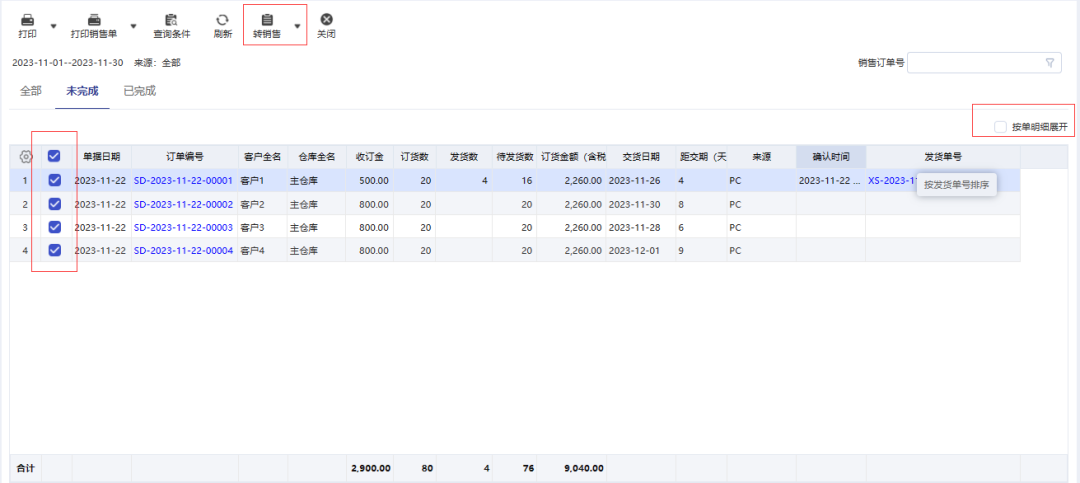 同时,也可以批量处理一切来源订单,在转单的同时,核准库存是否足够,销售价格是否符合公司要求。在提升工作效率的同时有效避免低价销售。如图2、图3、图4所示。